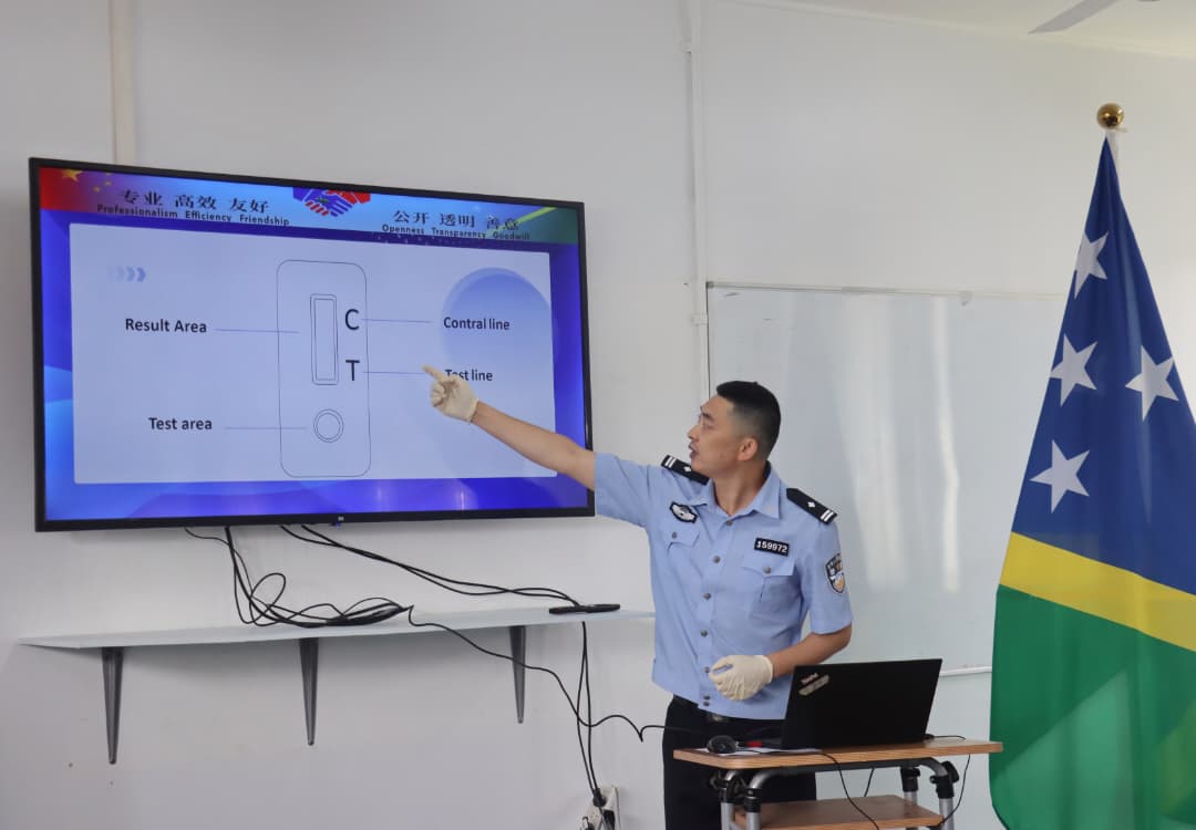 Following the ceremony, the CPLT donated 450 sets of drug testing kits, capable of detecting five categories of drugs, including cannabis and morphine. As part of the practical cooperation, CPLT anti-drug expert, Superintendent Zhang Guangyao conducted hands-on training for a total of 14 investigators from different police stations in Honiara.