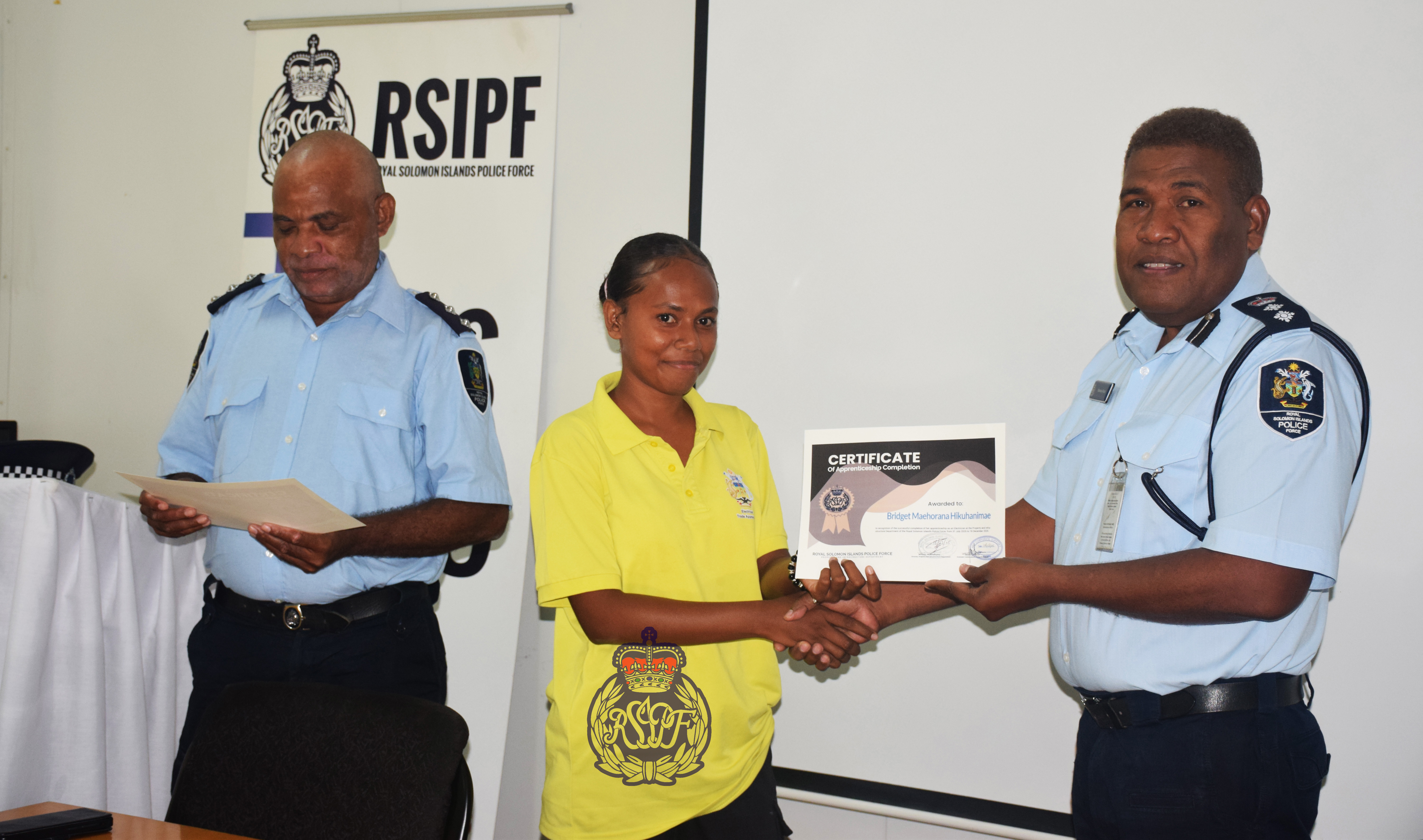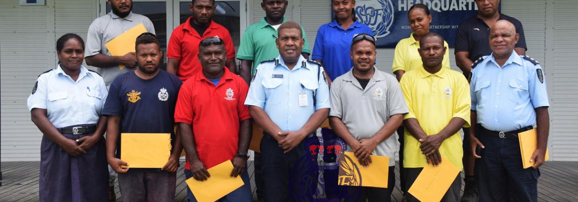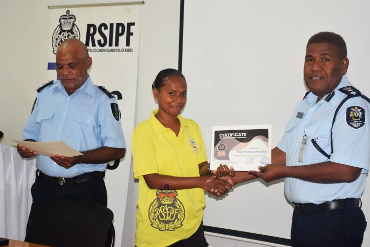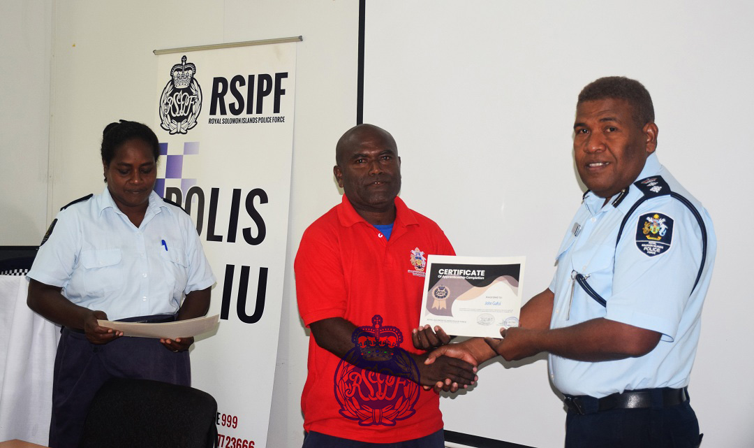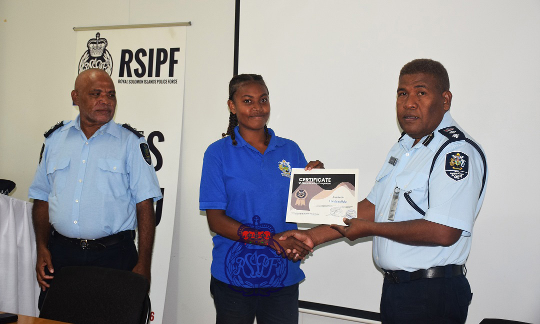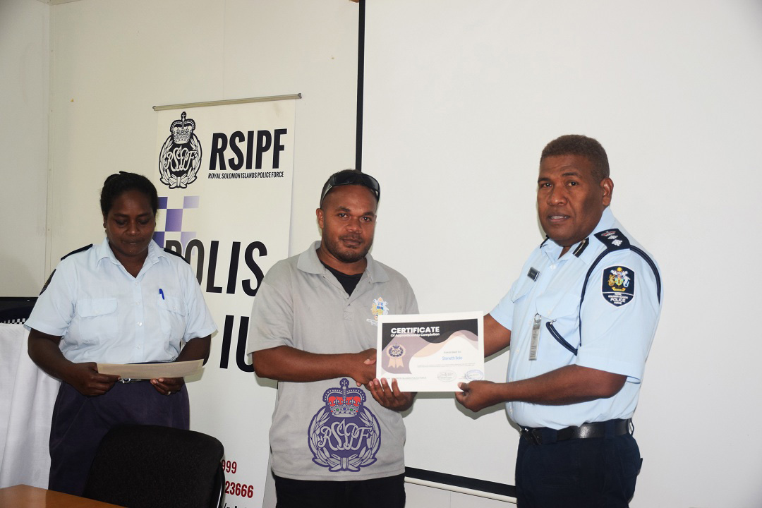 Police present certificates of appreciation to fifteen apprentices after they completed six months of practical work with the Property and Infrastructure Department (PID) and Garage of the Royal Solomon Island Police Force (RSIPF).